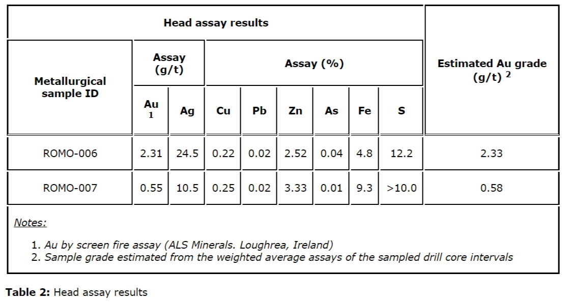 Subsamples of the two composite metallurgical samples were sent by WAI for head assay analysis at ALS Minerals' geochemical laboratory at Loughrea, Ireland and were analyzed for gold (by screen fire assay), silver, copper, lead, zinc, arsenic, iron and selenium. Additional analysis for deleterious elements was not undertaken, but this additional analytical work is planned. The results of the head assays are provided in an attached table.