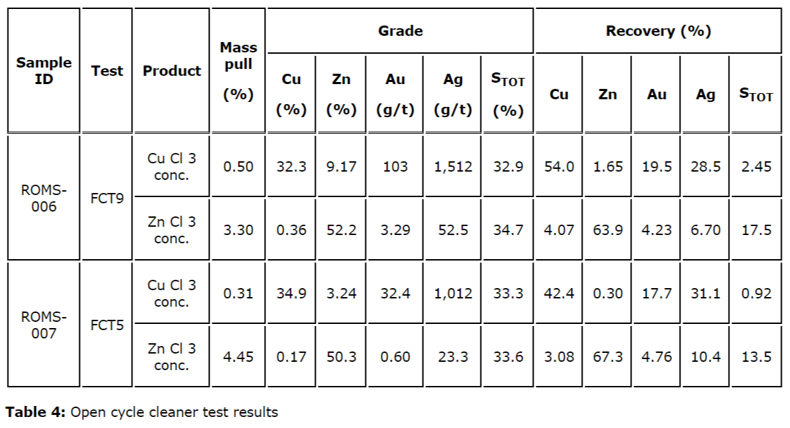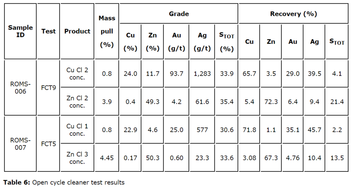 Three-stage open-circuit cleaner optimization test work demonstrated that, for sample ROMS-006, final concentrate grades of 32.3 per cent copper at a recovery of 54.0 per cent, and 52.2 per cent zinc at recovery of 63.9 per cent could be achieved, respectively. Furthermore, gold and silver were recovered to the final copper concentrate at grades of 103 grams per tonne gold and 1,512 grams per tonne silver, respectively.