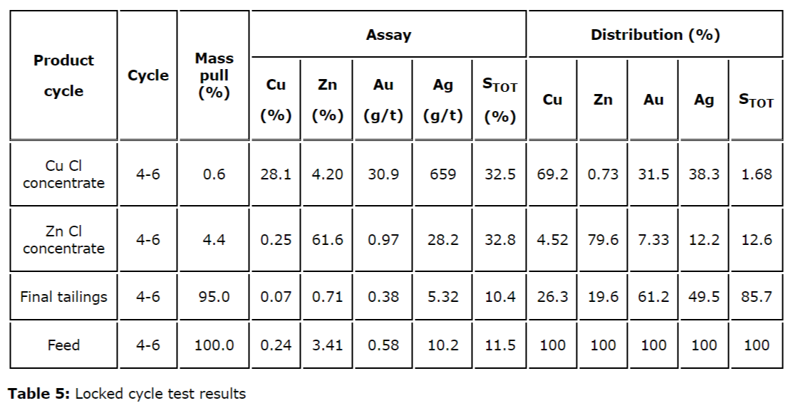 Results of the locked-cycle test indicate that saleable copper and zinc concentrates can potentially be produced with reasonable gold and silver credits.