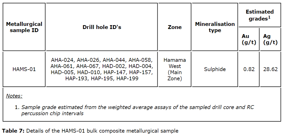 A bulk composite sample, HAMS-01, was collected from a combination of diamond drill half-core intervals (HQ size and PQ size; 10 holes) and RC percussion drill chips (five holes) to produce a total sample weight of 88.6 kg (see attached table). The holes sampled were spread out along the strike length and the entire vertical extent of the sulphide mineralization at Hamama West.