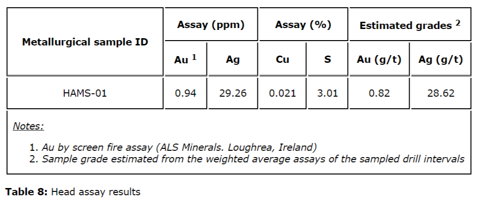 A subsample of the HAMS-01 metallurgical composite sample was sent by WAI for head assay analysis at ALS Minerals' geochemical laboratory at Loughrea, Ireland, and was analyzed for gold (by screen fire assay), silver, copper and sulphur. Additional analysis for deleterious elements was not undertaken, but this additional analytical work is planned. The results of the head assays are provided in an attached table.