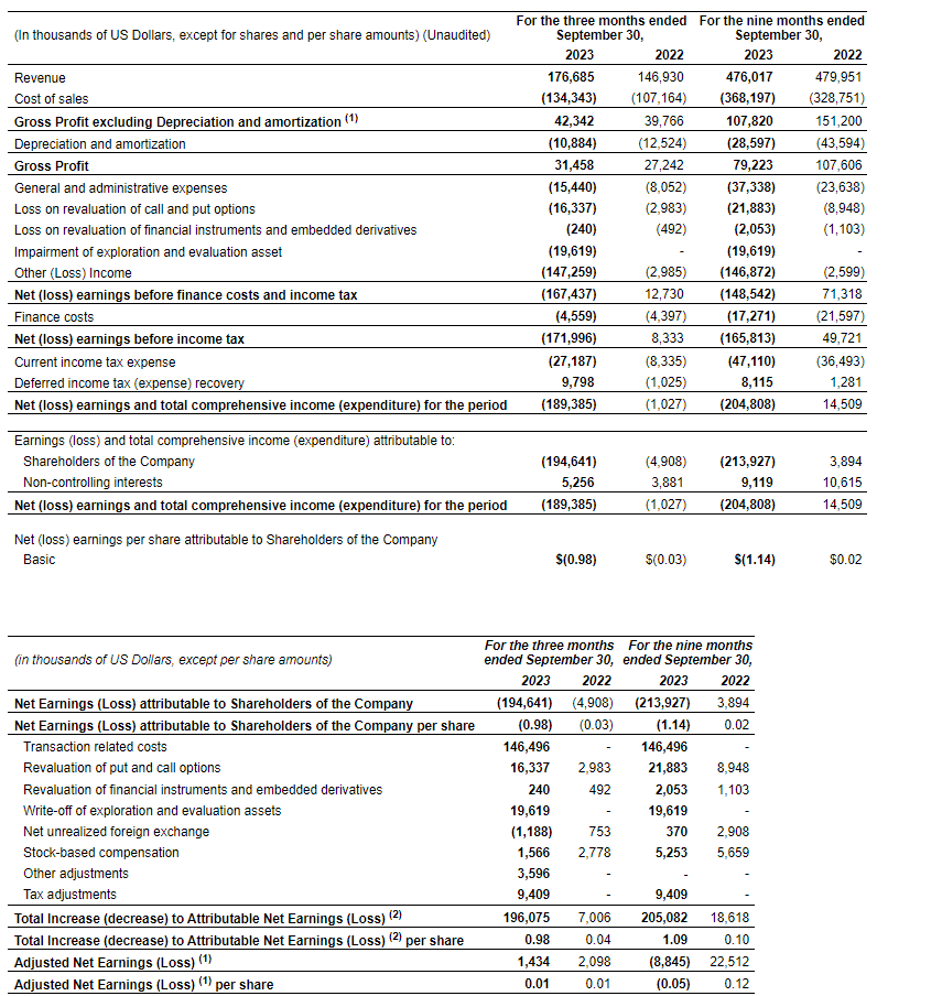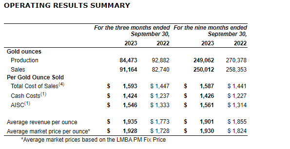 The current quarter's gold sales were positively impacted by the weather-related delay in the final gold shipment of the second quarter, totalling 8,170 oz, which was subsequently sold in July, 2023.