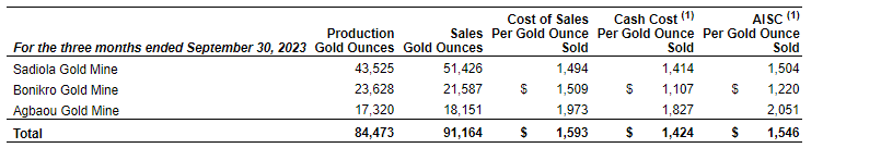 Production of 84,473 oz. Sequential improvements expected in the fourth quarter to be driven by increased equipment performance at Sadiola, completion of stage 1 stripping, along with ahead-of-schedule dewatering at Bonikro and higher rates of ore mined at Agbaou.