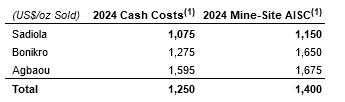 In the near term, Bonikro is expected to achieve modest yearly increases in gold production during the outlook period, with a goal of exceeding 110,000 ounces annually. This projection does not account for the potential additional benefits from Oume. This improvement is due to the stripping phase planned for 2024 that will expose higher-grade materials in 2025 and 2026, significantly reducing the mine-site AISC(1) to below $1,050 per ounce by the end of the outlook period. At Oume, there is potential for further gains, including advanced resource drilling at Oume West and North, as well as at the Akissi-So target south of Bonikro mill.