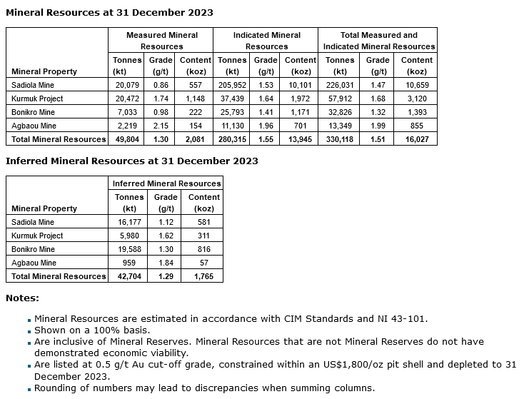 Allied's near-term guidance and longer-term outlook is supported by growing Mineral Reserves and Mineral Resources which underpin the longevity of the Company's sustainable production platform and the optionality to increase near term production and cash flows from near mine high-yield targets. As at December 31, 2023, Proven and Probable Mineral Reserves were reported at 11.2 million ounces of gold contained within 238 million tonnes at a grade of 1.46 g/t, an increase of over 300,000 ounces versus the previous year. This increase reflects meaningful growth at Sadiola, Agbaou and Kurmuk, with partial replacement of mining depletion at Bonikro. Similarly, total Measured and Indicated Mineral Resources grew to over 16.0 million ounces of gold contained within 330 million tonnes at a grade of 1.51 g/t, up from 15.2 million ounces in the previous year, partly due to the conversion of Inferred Mineral Resources, which ended the year at 1.8 million ounces contained within 43 million tonnes at a grade of 1.29 g/t. Highlights of the expanding mineral inventory, and the strategic initiatives leveraging their growth, include: