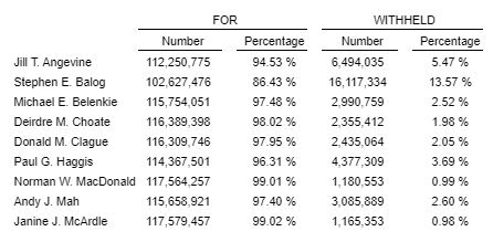 For complete voting results, please see the company's report of voting results, available on SEDAR.