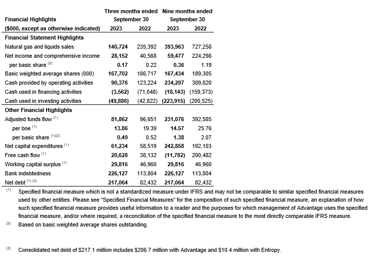 ADVANTAGE ANNOUNCES THIRD QUARTER 2023 FINANCIAL AND OPERATING RESULTS