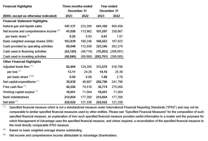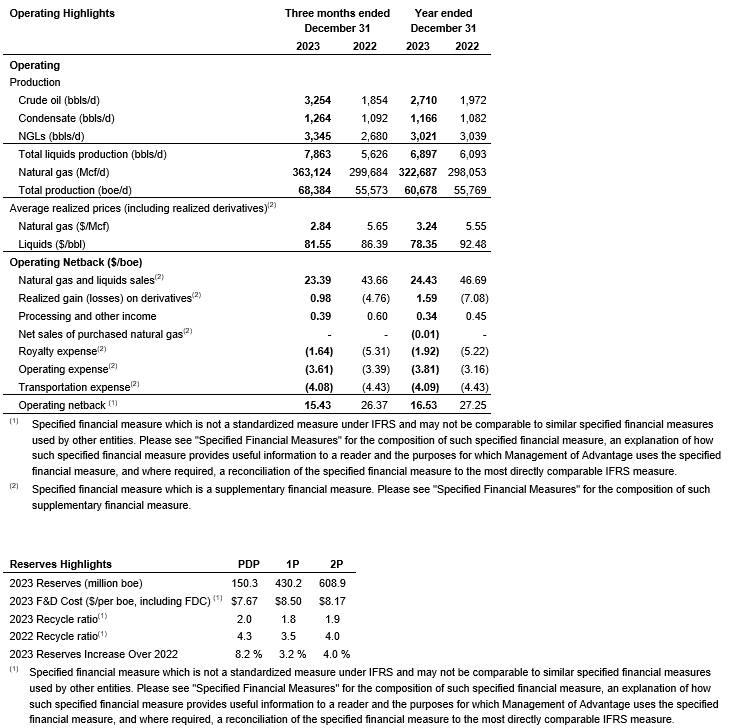 Advantage Energy Ltd. has released year-end 2023 financial and operating results, as well as year-end 2023 reserves.