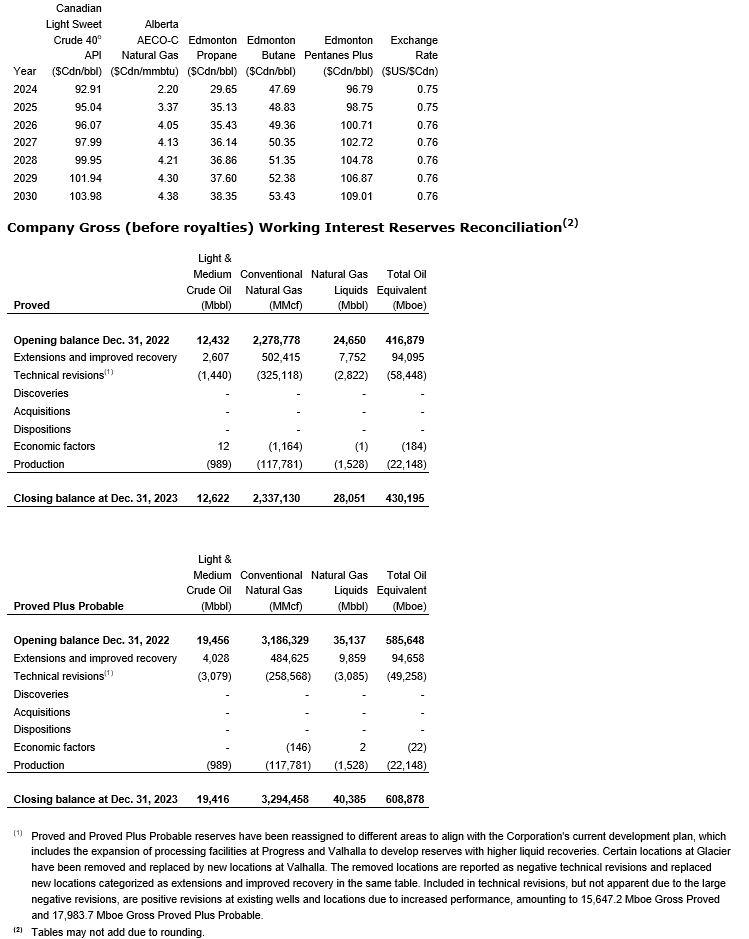 The net present value of future net revenue at Dec. 31, 2023, was based upon light and medium oil, conventional natural gas, and natural gas liquids pricing assumptions, which were computed by using the average of the forecasts prepared by McDaniel & Associates Consultants Ltd., GLJ Petroleum Consultants and Sproule, effective Dec. 31, 2023. These forecasts are adjusted for reserves quality, transportation charges and the provision of any applicable sales contracts. The price assumptions used over the next seven years are summarized herein.