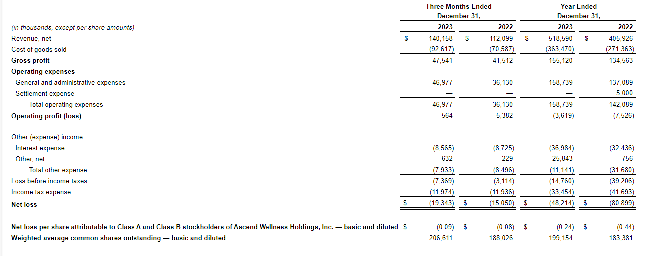 Ascend Wellness Holdings Inc. has released its financial results for the fourth quarter (Q4 2023) and full year (FY 2023) ended Dec. 31, 2023. Financial results are reported in accordance with U.S. generally accepted accounting principles (GAAP) and all currency is in U.S. dollars.
