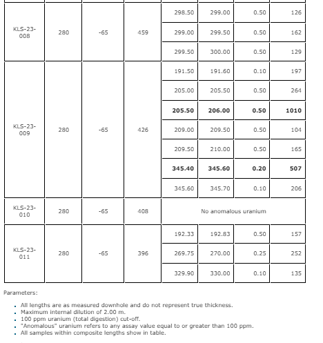 - KLS-23-004 intersected a total of 1.5 m of anomalous uranium, including 10 centimetres at 1,260 parts per million U.