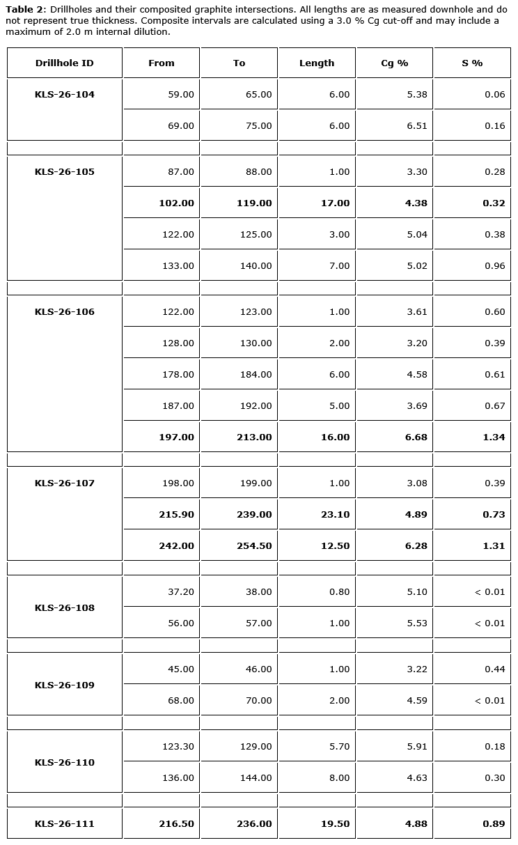 An additional four drill holes were completed at the Thor zone, which focused on testing the up-dip continuation of the two graphitic zones identified in KLS-25-072. The drilling at the Thor zone intersected graphitic zones similar to those intersected in the previous drilling program. Assay results for these drill holes are pending.