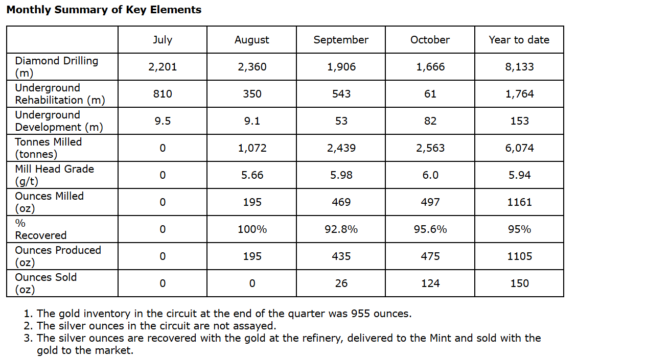 Pascal Hamelin, president and chief executive officer, stated: "We are continuing to advance development and production underground and at the mill. Our priority remains the hiring, onboarding and training of new employees. We went from 76 employees at the end of June to 106 at the end of October plus the addition of contractors to support us."