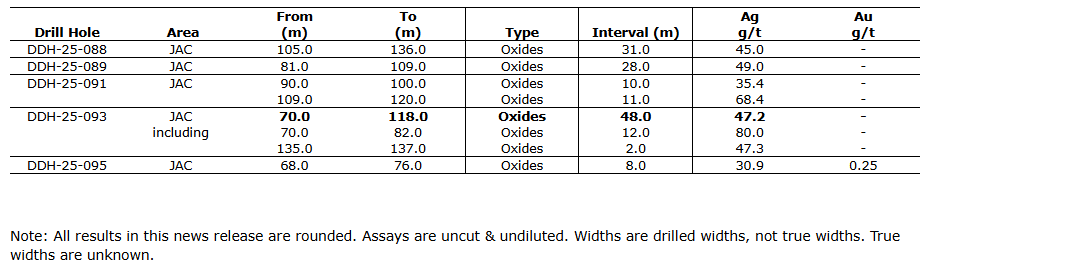 As part of the recently completed phase V drill program, the company has received additional assay results from drilling at JAC, which will be incorporated into the upcoming MRE. Recent drilling at JAC was primarily aimed at delineating the margins of known mineralization. Results confirm that silver mineralization remains present at the periphery of the deposit, although grades decrease as the company drills further away from the higher-grade core. The latest results are summarized in Table 1.