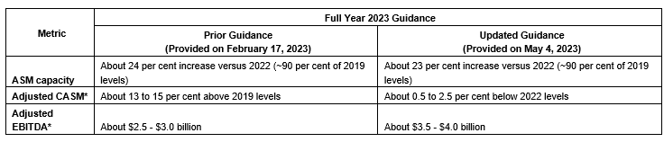 Air Canada is updating its guidance for 2023. The revised guidance for adjusted earnings before interest, taxes, depreciation and amortization* reflects expected earnings resulting from an improvement in traffic and yield from a stronger-than-anticipated demand environment and lower-than-expected fuel price. The revised guidance for adjusted CASM* reflects adjustments to various expense items, including those resulting from the higher-than-expected traffic. Air Canada's 2023 capacity guidance remains substantially unchanged.
