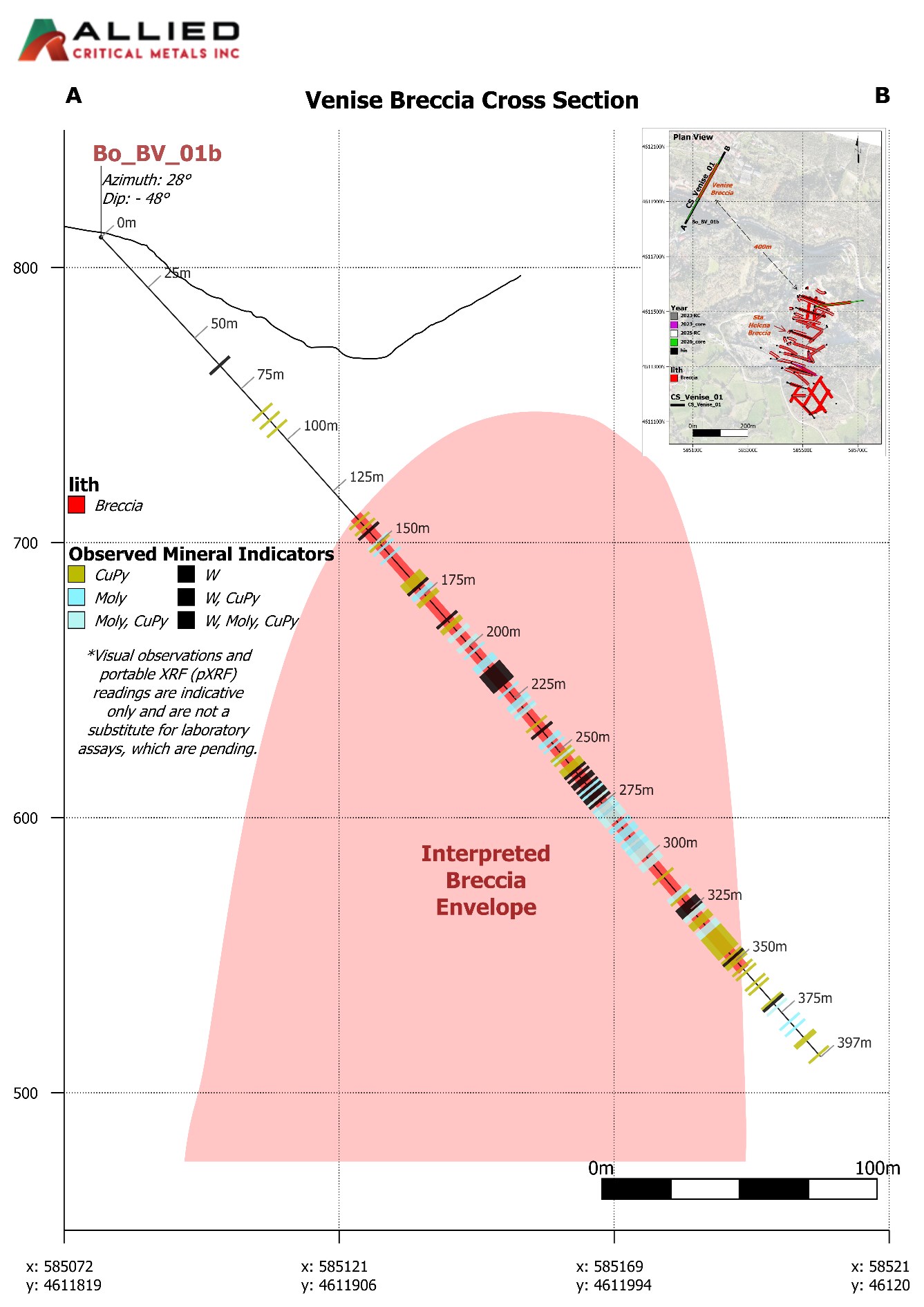 Roy Bonnell, CEO & Director of Allied, commented: "Intersecting visible tungsten mineralization within the historically documented Venise Breccia represents a significant step in validating the broader breccia-hosted potential at the Borralha Project. Located approximately 400 metres from the Santa Helena Breccia deposit, which underpins our recently announced initial PEA, this result reinforces our view that the Borralha Project hosts multiple breccia systems capable of supporting meaningful resource growth and mine life extension.