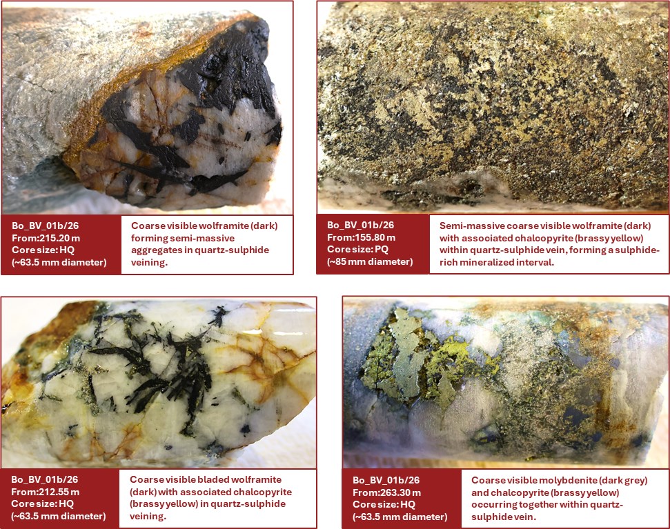 Figure 3 (above): Drill core from hole Bo_BV_01b/26 showing repeated occurrences of quartz-sulphide veining with visible wolframite tungsten mineralization (highlighted), demonstrating the distribution and continuity of mineralization along the downhole interval.