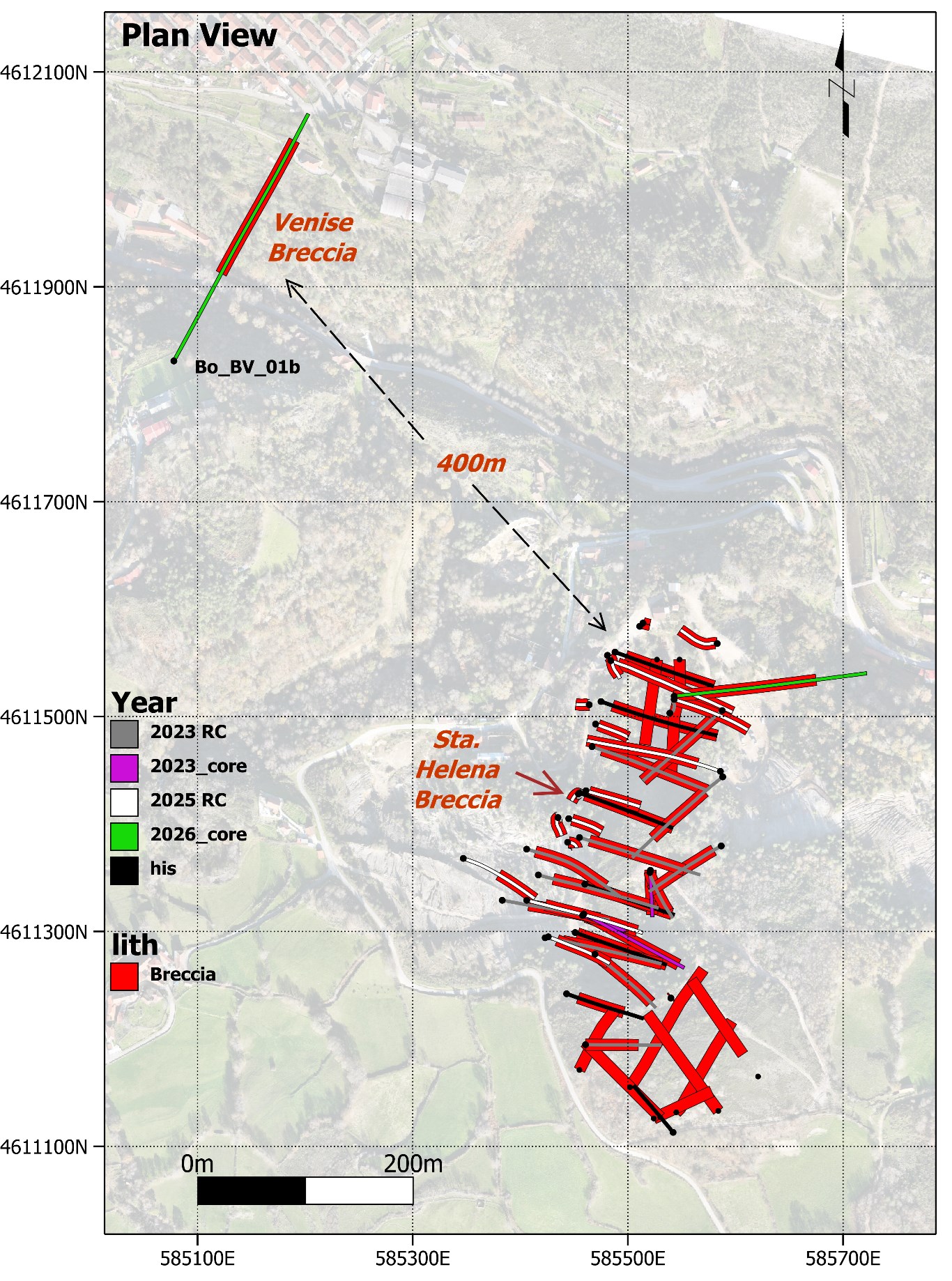 Figure 4 (above): Plan view showing drillhole Bo_BV_01b intersecting the interpreted Venise Breccia target envelope, located approximately 400 m northwest of the Santa Helena Breccia. Mineralization shown is based on visual logging and semi-quantitative pXRF readings.