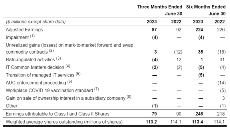 Second quarter earnings attributable to Class I and Class II Shares reported in accordance with International Financial Reporting Standards (IFRS earnings) were $79 million ($0.70 per share), $11 million ($0.09 per share) lower compared to $90 million ($0.79 per share) in the second quarter of 2022.