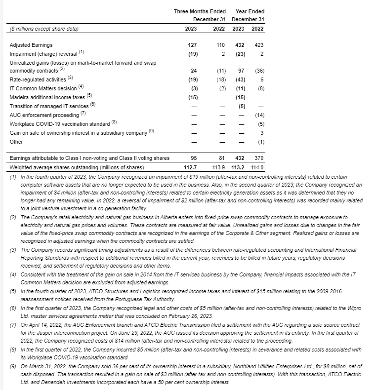 Atco Ltd. had adjusted earnings in 2023 of $432-million ($3.82 per share), which were $9-million (11 cents per share) higher compared with $423-million ($3.71 per share) in 2022. Fourth quarter adjusted earnings in 2023 of $127-million ($1.13 per share) were $17-million (16 cents per share) higher compared with $110-million (97 cents per share) in the fourth quarter of 2022.