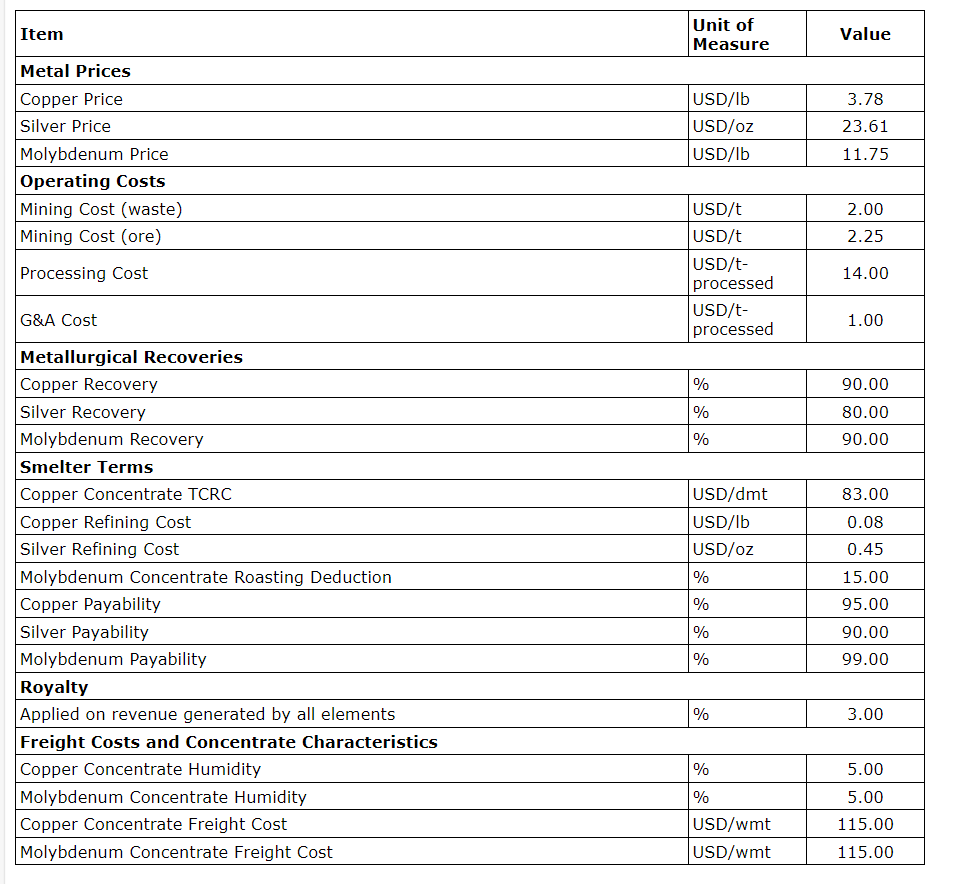 - Indicated resources of 25.3 million tonnes (Mt) at 0.30 per cent copper, 28.5 grams per tonne silver and 749 parts per million molybdenum (0.79 per cent copper equivalent grade), for a contained 444 million pounds (Mlb) of Cu equivalent.