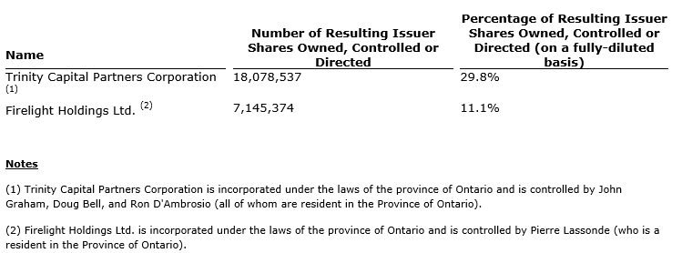Following closing of the proposed transaction, it is expected that, other than as set out below, no person or company will own of record or beneficially, directly or indirectly, or exercise control or direction, over more than 10 per cent of the shares of the resulting issuer shares after giving effect to the proposed transaction.