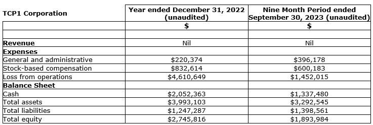 A summary of certain financial information for TCP1, disclosed in accordance with TSX-V policies, is included herein.
