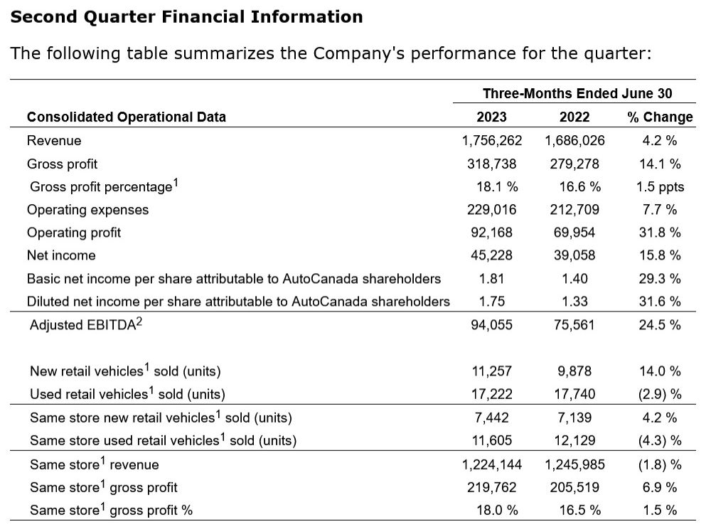 AutoCanada Inc. has released its financial results for the three-month period ended June 30, 2023.