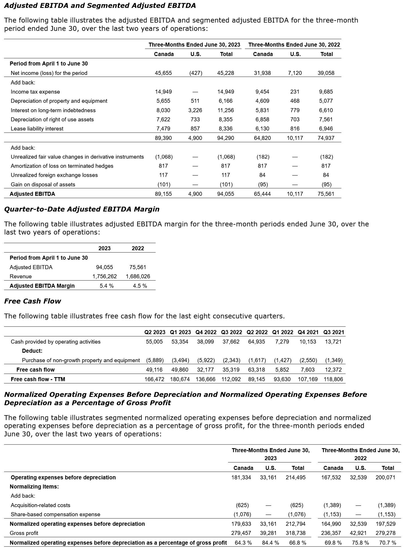 Free cash flow on a trailing 12 month (TTM) basis was $166.5-million at Q2 2023 as compared with $89.1-million in Q2 2022 with the increase in free cash flow driven primarily by recent acquisitions, improved operating performance and higher working capital.