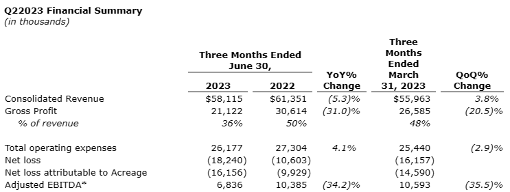 ACREAGE REPORTS SECOND QUARTER 2023 FINANCIAL RESULTS