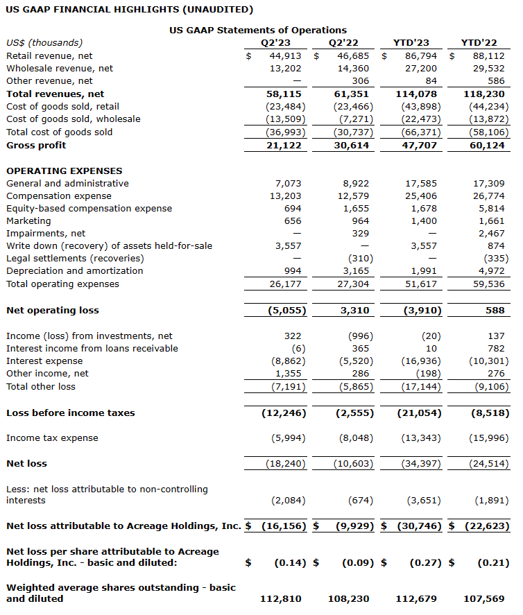 Net loss attributable to Acreage for Q2 2023 was $(16.2) million, compared to $(9.9) million in Q2 2022.