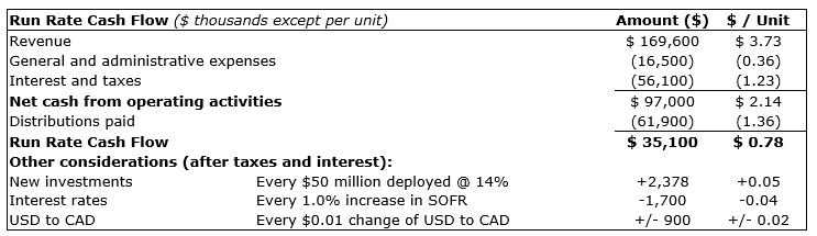 (6) Run rate cash flow is a non-GAAP financial measure and outlines the net cash from operating activities, net of distributions paid, that Alaris is expecting to have after the next 12 months. This measure is comparable with net cash from operating activities less distributions paid, as outlined in Alaris's consolidated statements of cash flows.