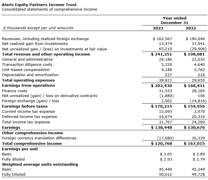 ALARIS EQUITY PARTNERS INCOME TRUST RELEASES 2023 FOURTH QUARTER AND ANNUAL FINANCIAL RESULTS