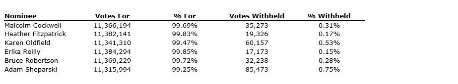 The nominees listed in the management proxy circular for the 2025 annual meeting of shareholders were elected as directors of Acadian Timber Corp. Detailed results of the votes for the election of directors held at the virtual annual meeting of shareholders on May 8, 2025, are set out in the attached table.