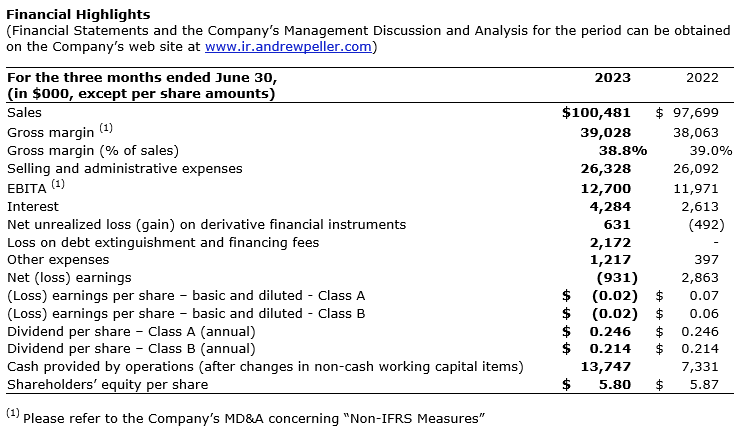 Andrew Peller Ltd. has released its results for the three months ended June 30, 2023.