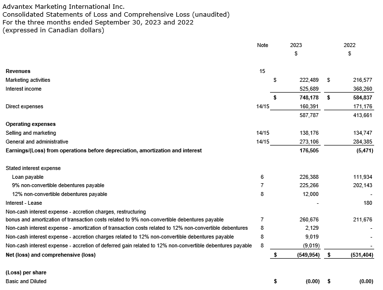 Advantex Marketing International Inc. has released its results for the three months ended Sept. 30, 2023.