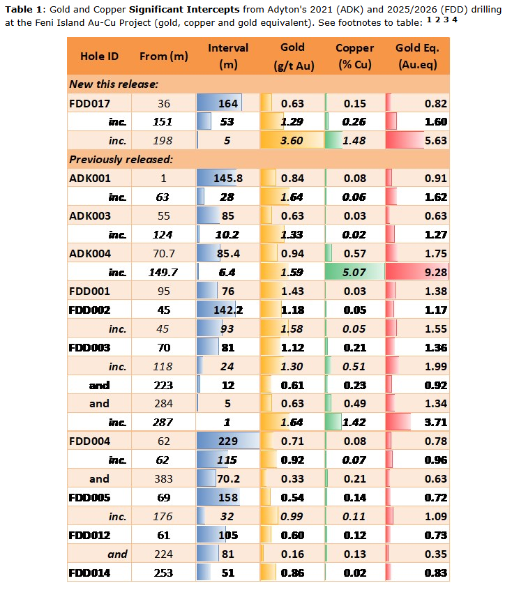 Adyton Resources Corp. has released positive expansionary drill results from its continuing exploration program at the 100-per-cent-owned Feni Island gold-copper project, located on the productive Lihir trend in Papua New Guinea. This announcement provides all the assay results for expansionary hole FDD017 (preliminary results were first reported on Feb. 18, 2026).
