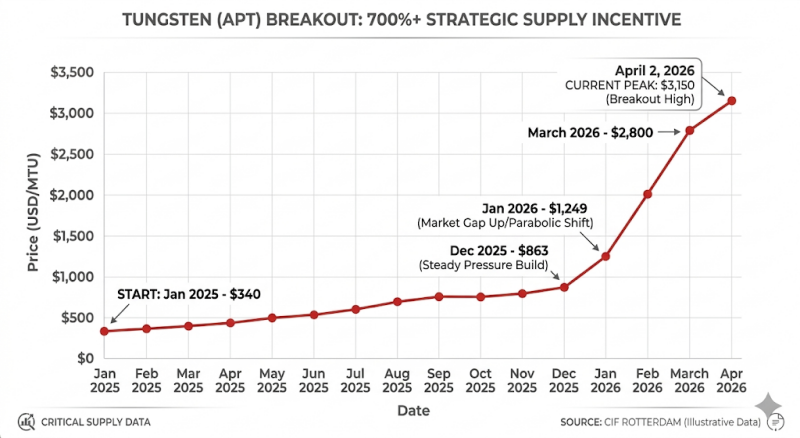 China dominates the supply side of the market, producing roughly 80% of tungsten yearly. In response to US tariffs, China has put severe export restrictions on tungsten products. Exports of Ammonium Paratungstate (APT), the primary product used as a manufacturing input worldwide, fell to zero in 2025. This has put severe constraints on the tungsten market. As of early April 2026, APT prices reached $3,150 per MTU (metric tonne unit, or 10 kilograms), up from about $300 per MTU in early 2025 (see Figure 3).