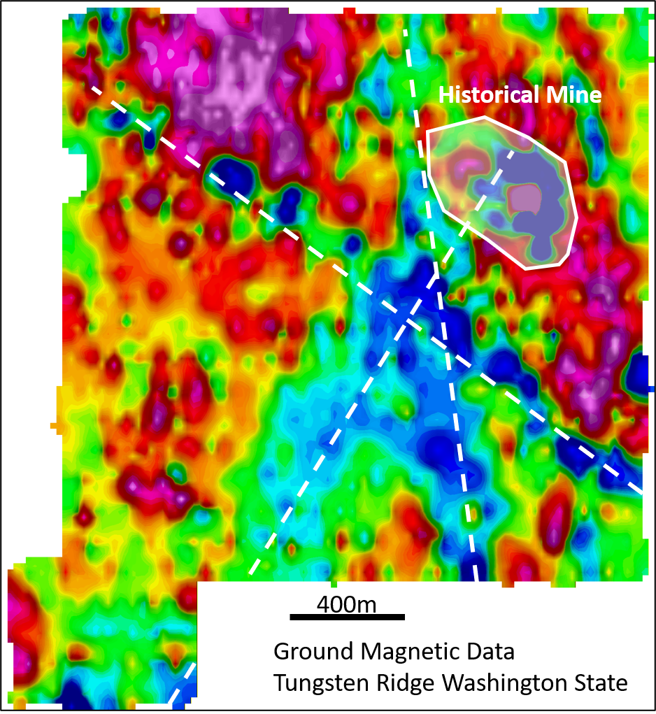 An obvious feature from the ground magnetic survey is a strong dipolar magnetic signature. This is characterized by a sharp, high-intensity magnetic peak immediately adjacent to a pronounced magnetic low (see Figure 2). This distinct, high-gradient dipole is located proximal to the historical underground mine workings. This is considered a classic geophysical response for near-surface accumulations of massive magnetite and/or pyrrhotite. These are the primary skarn host minerals for the scheelite (tungsten), copper, molybdenite, and silver mineralization at Tungsten Ridge.