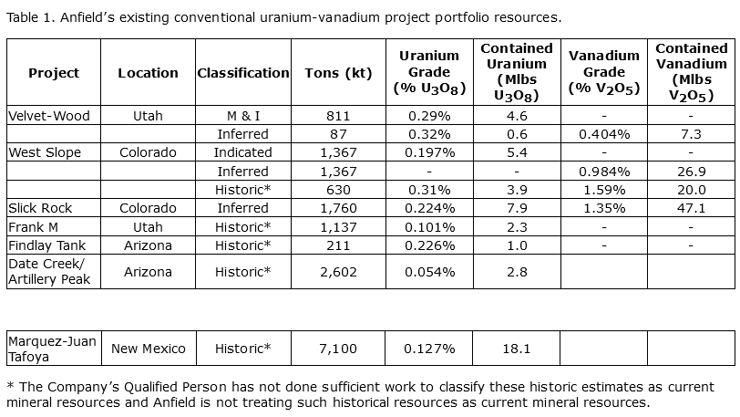 Anfield's conventional uranium assets consist of mining claims and state leases in southeastern Utah, Colorado, and Arizona, targeting areas where past uranium mining or prospecting occurred. Anfield's conventional uranium assets include the Velvet-Wood Project, the Slick Rock Project, the West Slope Project, the Frank M Uranium Project, the Findlay Tank breccia pipe as well as an additional 12 U.S. Department of Energy (DoE) leases in Colorado. A combined NI 43-101 PEA has been completed for the Velvet-Wood Project and the Slick Rock Project. The PEA is preliminary in nature, and includes inferred mineral resources that are considered too speculative geologically to have economic considerations applied to them that would enable them to be categorized as mineral reserves, and there is no certainty that the preliminary economic assessment would be realized. All conventional uranium assets are situated within a 200-mile radius of the Shootaring Mill.