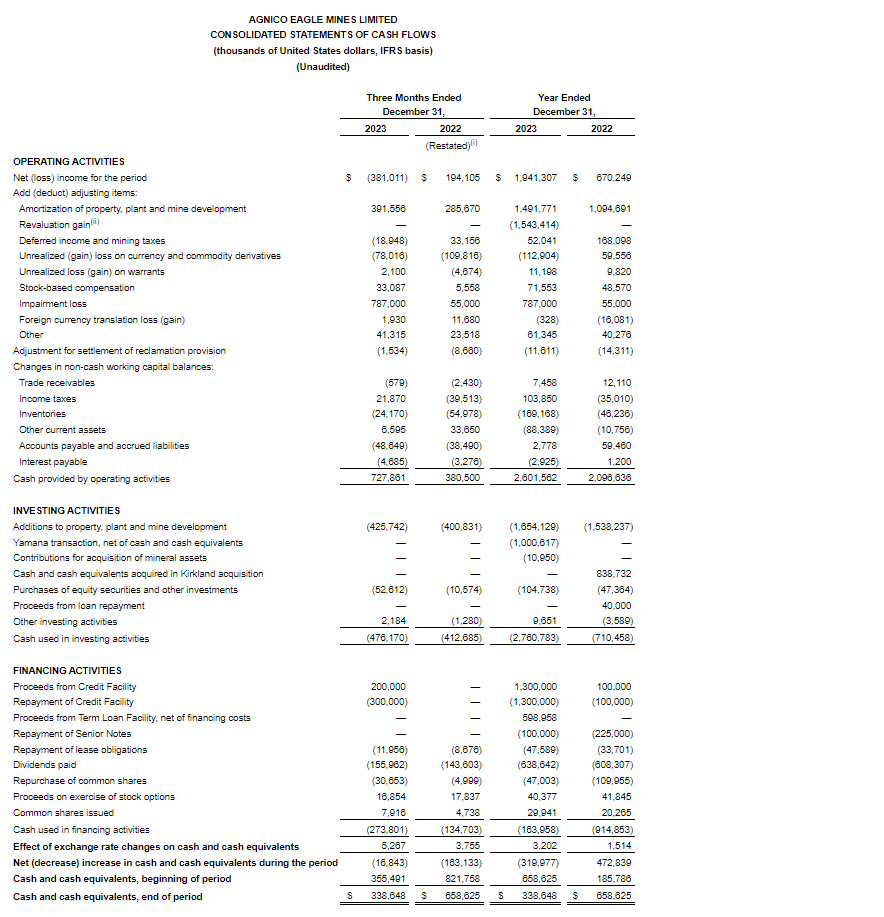 • Record quarterly cash provided by operating activities and free cash flow -- The company reported a quarterly net loss of $381.0-million or 77 cents per share and adjusted net income of $282.3-million or 57 cents per share for the fourth quarter of 2023. Included in the quarterly net loss are impairment charges totalling $667-million (net of tax) or $1.35 per share relating to the Macassa and Pinos Altos mines. Cash provided by operating activities was $1.47 per share ($1.57 per share before working capital adjustments) and free cash flow was 61 cents per share (71 cents per share before working capital adjustments).