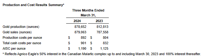 "Building on a very strong close to 2023, we are reporting our second consecutive quarter of record operating margins and record free cash flow, on the back of solid operational and cost performance. With this strong start to the year, we are well positioned to achieve our production and cost guidance for 2024," said Ammar Al-Joundi, Agnico Eagle's President and Chief Executive Officer. "During the quarter, we continued to advance our key value drivers and project pipeline, and our exploration program yielded significant results at Hope Bay, Canadian Malartic and Detour Lake. We strengthened our balance sheet in the quarter and our focus remains on capital discipline and cost control, while investing in our projects pipeline and providing returns to shareholders," added Mr. Al-Joundi.