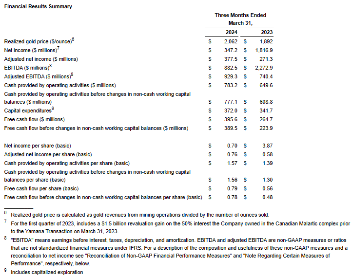 Net income of $347.2 million in the first quarter of 2024 decreased when compared to net income of $1,816.9 million in the prior-year period primarily due to the recognition of a $1,543.4 million remeasurement gain on the 50% of the Canadian Malartic complex that the Company owned prior to the Yamana Transaction in the prior-year period, partially offset by higher revenues from higher gold sales and higher realized gold prices in the current period.