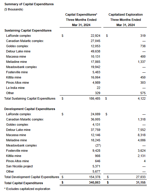 The capital expenditures in the first quarter of 2024 were lower than forecast primarily due to the deferral of certain sustaining capital expenditures at Detour Lake mine to later in 2024. Total expected capital expenditures (including capitalized exploration) remain in line with guidance for the full year 2024.
