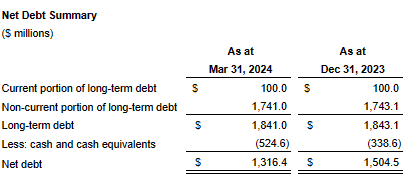 As at March 31, 2024, the Company's long-term debt was $1,841.0 million, consistent with the prior quarter. No amounts were outstanding under the Company's unsecured revolving bank credit facility as at March 31, 2024.