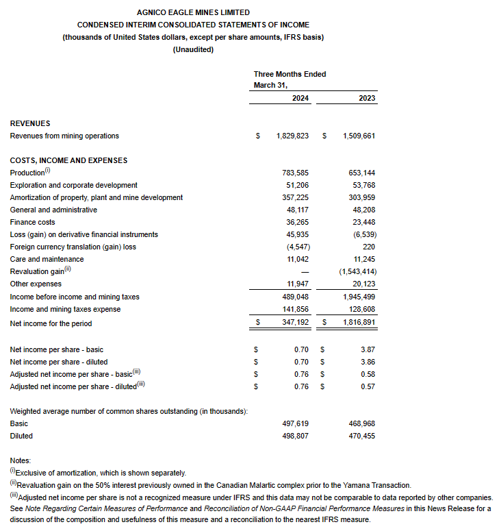 Agnico Eagle Mines Ltd. has released its financial and operating results for the first quarter of 2024 (all amounts expressed in U.S. dollars unless otherwise noted).