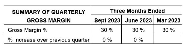 Gross margin for the nine months ended September 30, 2023 was 30%, which is lower than gross margin of 32% for the nine months ended September 30, 2022. Gross margins decreased due to the more competitive market for sales that is driven by the significantly lower cost of lumber compared to the prior period. Closer to the end of the nine months ended September 30, 2023, the Company had to find a balance between generating sales and compromising slightly on the gross margin available in a more competitive market. The Company continues to focus on gross margins as well as revenue generation. Typically, the Company has an increase in gross margins for the third quarter, but due to the competitive market, lower lumber prices and demand not increasing the Company had to lower gross margins slightly in order to generate more revenues. The Company was still able to maintain consistent gross margins for fiscal 2023 as seen in the table below.