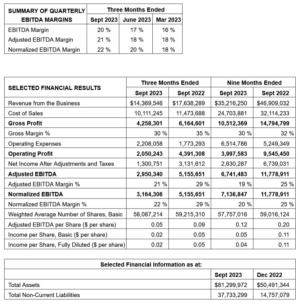 Non-IFRS measure normalized EBITDA margin decreased to 20% for the nine months ended September 30, 2023 from 25% for the nine months ended September 30, 2022. These decreases were mainly due to decreased gross margins and increased operating costs. Some acquisition costs have been added back to normalized EBITDA, but additional support costs for the Company's growth were not added back as these will be ongoing costs moving forward. The table below demonstrates how the additional support required impacted these margins in the first and second quarter, but these EBITDA margins have risen as results from LCF were included in the third quarter from the acquisition date of August 23, 2023 that offset the additional costs required for growth.