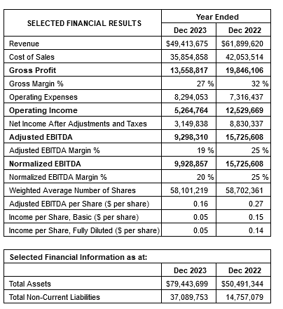 Normalized EBITDA margin, a Non-IFRS measure, decreased to 20 per cent for the year ended Dec. 31, 2023, from 25 per cent for the year ended Dec. 31, 2022. This decrease was mainly due to decreased gross margins and increased operating costs. The company has added $630,547 in one-time, non-recurring acquisition costs back to normalized EBITDA, but additional support costs, such as bolstering human resources and upgrading internal systems to support the acquisitive growth of the company, were not added back as these will be continuing costs moving forward.