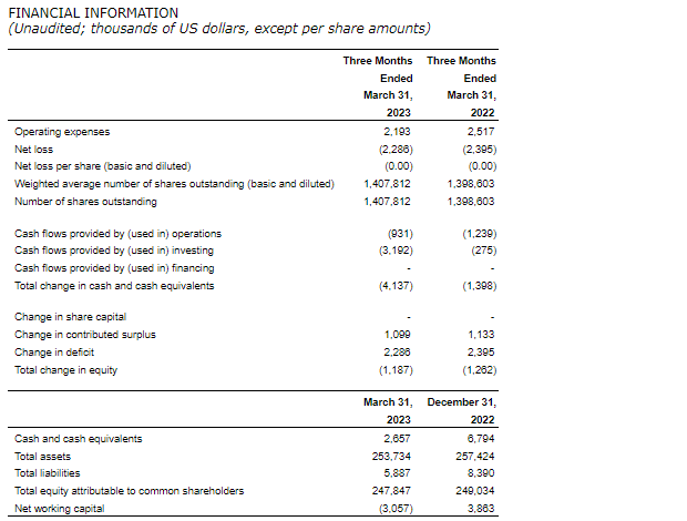The company recorded $2.2-million of operating expenses for the three months ended March 31, 2023, compared with $2.5-million for the same period in 2022. Salary and benefit costs decreased by $500,000 due to a reduction in annual bonuses paid compared with the same period in 2022. During the three months ended March 31, 2023, the company incurred $300,000 of operating costs relating to Block 2B.